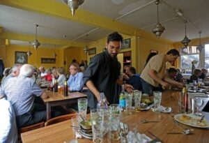 A waiter clears the table after diners in the restaurant of the India Club in London, Britain, September 13, 2023. REUTERS/ Susannah Ireland