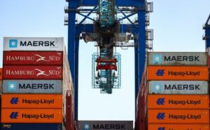 FILE PHOTO: A crane prepares to unload containers stacked on the deck of the Maribo Maersk container ship at a terminal wharf in Bremerhaven, Germany, August 13, 2025. REUTERS/Leon Kuegeler/File Photo