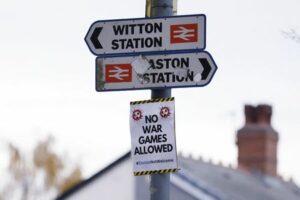 Soccer Football – UEFA Europa League – Aston Villa v Maccabi Tel Aviv – Villa Park, Birmingham, Britain – November 6, 2025 A protest sign is seen on a lamppost outside the stadium before the match Action Images via Reuters/Andrew Couldridge