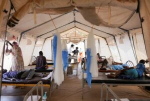 Injured displaced Sudanese people who fled violence in al-Fashir receive treatment at a makeshift clinic run by Medecins Sans Frontieres (MSF), amid ongoing clashes between the paramilitary Rapid Support Forces (RSF) and the Sudanese army, in Tawila, North Darfur, Sudan November 3, 2025. REUTERS/Mohamed Jamal