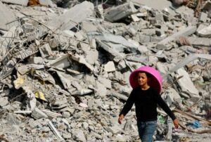 FILE PHOTO: A Palestinian youth walks past the rubble of destroyed buildings, amid a ceasefire between Israel and Hamas, in Gaza City, November 2, 2025. REUTERS/Mahmoud Issa/File Photo
