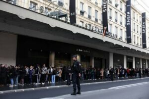 French police secure the area as people queue to enter the Le BHV Marais department store, the Bazar de l’Hotel de Ville, on the day of the opening of the first physical space for Chinese online fast-fashion retailer Shein within the Parisian department store, in Paris, France, November 5, 2025. REUTERS/Abdul Saboor