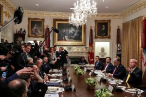 U.S. President Donald Trump takes questions from reporters during a bilateral lunch with Hungarian Prime Minister Viktor Orban, Vice President JD Vance, and Secretary of Defense Pete Hegseth at the White House in Washington, D.C., U.S., November 7, 2025. REUTERS/Jonathan Ernst