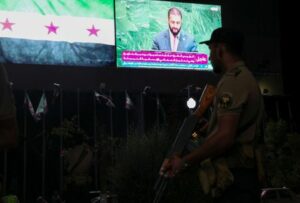 A member of the Syrian security forces stands during President Ahmad al-Sharaa’s address at the United Nations General Assembly meeting, in Aleppo, Syria, Septemper 24, 2025. REUTERS/Mahmoud Hassano