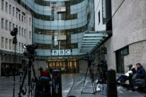 Members of the media gather outside the BBC Broadcasting House after Director General of BBC Tim Davie and Chief Executive of BBC News Deborah Turness resigned following accusations of bias at the British broadcaster, including in the way it edited a speech by U.S. President Donald Trump, in London, Britain, November 10, 2025. REUTERS/Jack Taylor