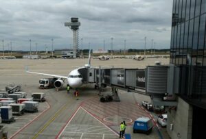 An aircraft is connected to a gate via a passenger boarding bridge at Berlin Brandenburg Airport in Schoenefeld, Germany, July 17, 2025. REUTERS/Lisi Niesner