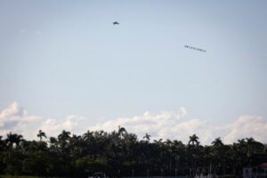 Un avión remolca una pancarta que dice “Trump está en los archivos de Epstein” cerca de la residencia del presidente estadounidense Donald Trump en Mar-a-Lago, Palm Beach, Florida, EEUU, 23 de octubre de 2025. REUTERS/Marco Bello