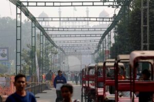 People gather near the site of Monday’s deadly car blast, in front of the historic Red Fort in the old quarters of Delhi, India, November 12, 2025. REUTERS/Adnan Abidi