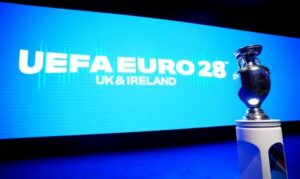 Soccer Football – UEFA Euro 2028 Launch Event – Below The Lights, London, Britain – November 12, 2025 Feneral view of the The EURO trophy: Henri Delaunay Cup during the UEFA EURO 2028 launch James Manning/Pool via REUTERS