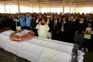 People attend the funeral of Zubair Aslam Ghuman, a lawyer