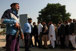 Police officers stand guard as the lawyers arrive to attend the funeral of Zubair Aslam Ghuman, a lawyer who was killed yesterday in a blast, in Islamabad, Pakistan November 12, 2025. REUTERS/Akhtar Soomro
