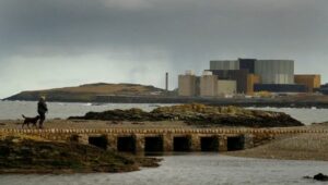 FILE PHOTO: A woman walks her dog on a beach in front of the decommissioned Wylfa nuclear power station on the island of Anglesey, Britain, January 28, 2019. REUTERS/Phil Noble/File Photo