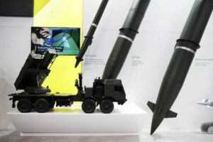 A PULS multiple rocket launcher miniature and artillery rockets by Israeli Elbit Systems is exhibited at the DEFEA Defence Exhibition, in Athens, Greece, May 8, 2025. REUTERS/Louiza Vradi