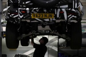 An engineer works below a Land Rover Defender mild hybrid electric vehicle at the new Jaguar Land Rover electric vehicle test centre in Whitley, Britain, October 23, 2023. REUTERS/Phil Noble