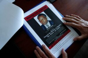 Eric Emeraux, head of the Gendarmerie’s Central Office for Combating Crimes Against Humanity, Genocides and War Crimes (OCLCH), diplays documents with a wanted poster depicting a photograph of Felicien Kabuga during an interview with Reuters at his office, about the arrest of Rwandan genocide fugitive suspect Felicien Kabuga, in Paris, France, May 19, 2020. REUTERS/Benoit Tessier