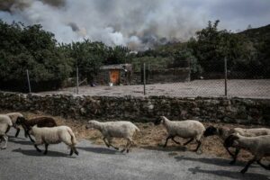 Sheep run as a wildfire approaches the outer bounds of the village of Parafita, Galicia region, Spain, August 12, 2025. Although the record-breaking wildfires that ripped across Spain and Portugal in August have subsided, residents in rural communities in Spain’s northwestern Galicia region are still battling the aftermath. Spain’s COAG national farmers’ association estimated that the fires had caused at least 600 million euros ($699.72 million) in damages, devastating crops and buildings and leaving livestock dead in the fields. REUTERS/Violeta Santos Moura SEARCH “IBERIA WILDFIRES AFTERMATH” FOR THIS STORY. SEARCH “WIDER IMAGE” FOR ALL STORIES.