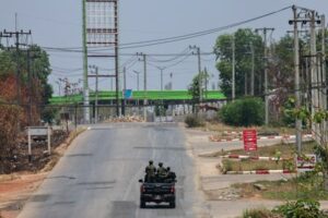 FILE PHOTO: Soldiers from the Karen National Liberation Army (KNLA) patrol on a vehicle, next to an area destroyed by Myanmar’s airstrike in Myawaddy, the Thailand-Myanmar border town under the control of a coalition of rebel forces led by the Karen National Union, in Myanmar, April 15, 2024. REUTERS/Athit Perawongmetha/File Photo