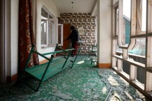 Mubarak Shah, a caretaker, inspects damage to a building near the site of an explosion at a police station in Srinagar, Indian Kashmir, November 15, 2025. REUTERS/Sharafat Ali