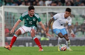 Brian Rodríguez (10) e Israel Reyes (15) disputan el balón durante el partido amistoso entre las selecciones de México y Uruguay. Estadio TSM Corona, Torreón, México. 15 de noviembre de 2025.