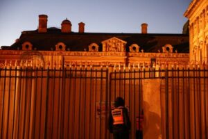 A security guard stands outside of Louvre Museum, after its Campana Gallery, originally built in 1930s, which displays a collection of Greek vases and houses the museum’s office spaces, was shut down due to structural issues, weeks after a daylight heist exposed security flaws, in Paris, France, November 17, 2025. REUTERS/Abdul Saboor