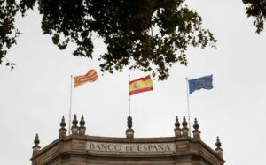 FOTO DE ARCHIVO: Una bandera catalana, española y europea ondean en el tejado del Banco de España, tres días después del referéndum independentista prohibido en Barcelona, España 4 de octubre de 2017. REUTERS/Yves Herman