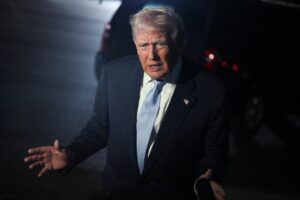 El presidente de Estados Unidos, Donald Trump, habla con los medios de comunicación mientras sube al Air Force One de camino a Washington, en el Aeropuerto Internacional de Palm Beach, en West Palm Beach, Florida, Estados Unidos. 16 de noviembre de 2025. REUTERS/Annabelle Gordon