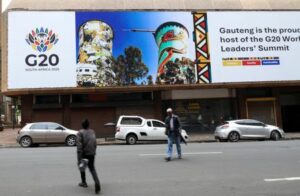 People walk in front a G20 banner, as the country prepares to host the G20 Summit on November 22-23, in Johannesburg, South Africa, November 18, 2025. REUTERS/Siphiwe Sibeko
