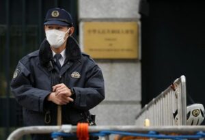 Un agente de policía japonés monta guardia en la entrada de la embajada china en Tokio, Japón, el 18 de noviembre de 2025. REUTERS/Issei Kato