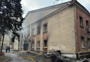 People stand near the building of the Dnipro newsroom of public broadcaster Suspilne, hit by a Russian drone strike, amid Russia’s attack on Ukraine, in Dnipro, Ukraine November 18, 2025. REUTERS/Mykhailo Moskalenko