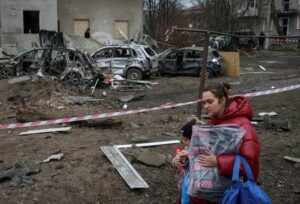 Residents carry humanitarian aid at the site of apartment buildings damaged during Russian missile strikes in the town of Balakliia, Kharkiv region, Ukraine. REUTERS/Anatolii Stepanov