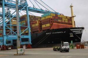 Workers handle containers at APM Terminals in the port of Callao as the company prepares for a new phase of the terminal’s expansion, in Callao, Peru November 19, 2025. REUTERS/Gerardo Marin