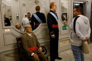 A man looks at a wax figure of Spanish former dictator Francisco Franco next to a wax figure of Spain’s former King Juan Carlos, whom Franco designated as his official successor in 1969, at Madrid’s wax museum in Madrid, Spain, October 29, 2025. REUTERS/Susana Vera