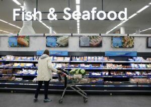 FILE PHOTO: A shopper browses in the fresh fish section at a Tesco Extra supermarket in Cheshunt, Britain, March 25, 2025. REUTERS/Toby Melville/File Photo