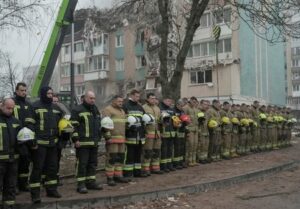 Rescuers stand during a minute of silence at the site of an apartment building hit yesterday by a Russian missile strike, amid Russia’s attack on Ukraine, in Ternopil, Ukraine November 20, 2025. REUTERS/Andriy Bodak