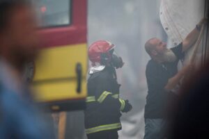 A firefighter stands next to a man removing a tent cover due to a fire alert during the UN Climate Change Conference (COP30), in Belem, Brazil, November 20, 2025. REUTERS/Adriano Machado