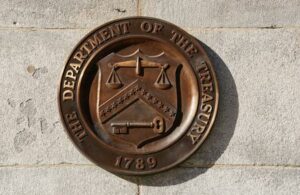 Un sello de bronce para el Departamento del Tesoro se muestra en el edificio del Tesoro de EEUU en Washington, EEUU, 20 de enero de 2023. REUTERS/Kevin Lamarque