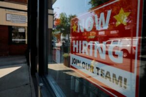Un cartel de “Se solicita personal” cuelga en la ventana