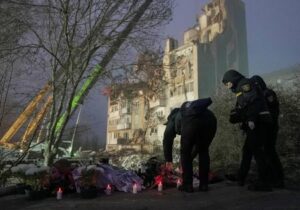 Rescuers light candles at a makeshift memorial at the site of an apartment building hit yesterday by a Russian missile strike, amid Russia’s attack on Ukraine, in Ternopil, Ukraine November 20, 2025. REUTERS/Andriy Bodak