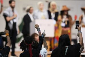 La sociedad civil, activistas e indígenas celebran una sesión durante la Plenaria de los Pueblos en la Conferencia de las Naciones Unidas sobre el Cambio Climático (COP30), en Belem, Brasil, 21 de noviembre de 2025. REUTERS/Adriano Machado