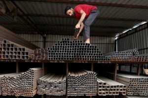 A worker unload steel bars in a steel godown on November 21, 2025 November 21, 2025 A worker unload steel bars in a steel godown on the outskirts of Ahmedabad, India, January 31, 2025. REUTERS/Amit Dave