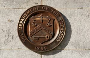 FOTO DE ARCHIVO: Un sello de bronce del Departamento del Tesoro se muestra en el edificio del Tesoro de Estados Unidos en Washington, Estados Unidos. 20 de enero de 2023. REUTERS/Kevin Lamarque/