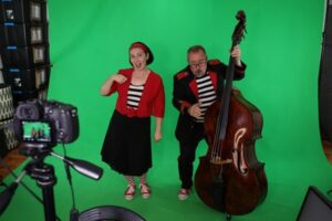 Husband-and-wife duo Tina and Mark Harris, members of the children’s entertainment group Lah-Lah, film a song for their YouTube channel at their studio in Sydney, Australia, November 3, 2025. REUTERS/Hollie Adams