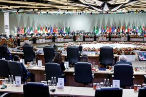 Leaders attend a plenary session on the second day of the G20 Leaders’ Summit at the Nasrec Expo Centre in Johannesburg on November 23, 2025. MARCO LONGARI/Pool via REUTERS