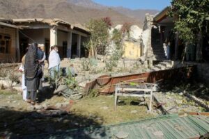 People stand in front of damaged houses that the Afghan Taliban government said were damaged after Pakistan carried out raids, in Asadabad, Kunar province, Afghanistan, November 25, 2025. REUTERS/Stringer
