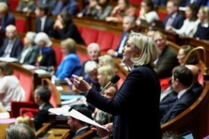 FILE PHOTO: French far-right leader and member of parliament Marine Le Pen, attends a parliamentary debate on the Social Security Financing Bill for 2026, including the suspension of the contentious 2023 pension reform, at the National Assembly in Paris, France, November 12, 2025. REUTERS/Gonzalo Fuentes/File Photo
