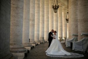 FILE PHOTO: A couple kiss during their wedding photo session under the Vatican colonnade in the Vatican, April 29, 2025. REUTERS/Stoyan Nenov/File Photo